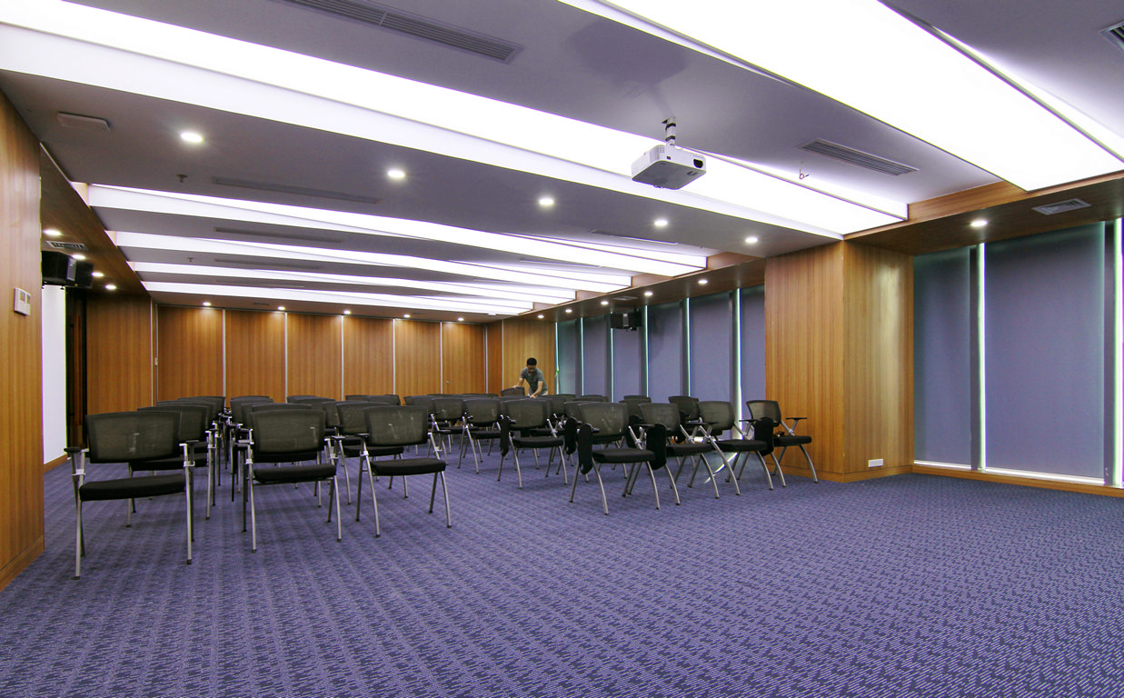 The challenge to design this project was to over come the low ceiling height and also to create new attractive common area for the one of the most creative and biggest Online Corporation in Vietnam. Our idea was make the unique ceiling system that integrate light, air-con vents and other technical equipment into something which is the very neat in form but visually spacious. The unique ceiling system was formed by series of crosswise module of gypsum ceilings and stretch ceilings alternately. The ceiling brings the effect of higher and spacious auditorium although the place that hold up to only 200 spectators. The overall feel and look of the auditorium is modern,hi-tech, neat and bold but also active and attractive. So many different details was design and decided carefully to get the perfect join and finishes.